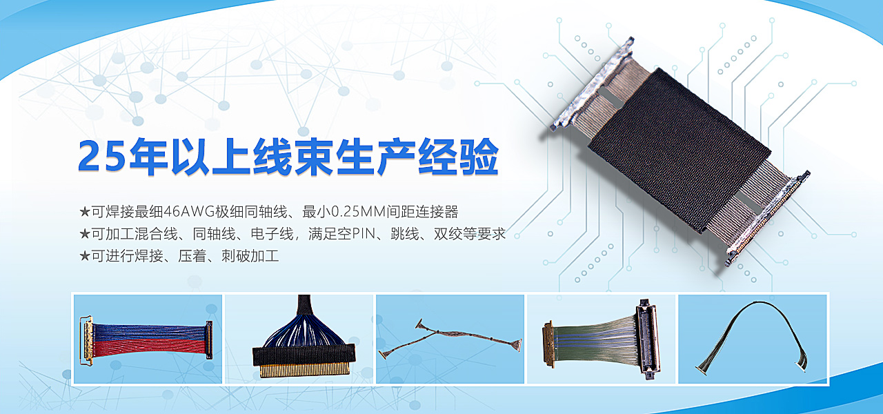 公司主營極細(xì)同軸線束、車載信號線束、航空頭線束、RF射頻線、電子接插件、微動開關(guān)等